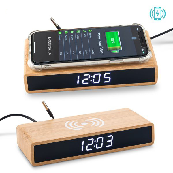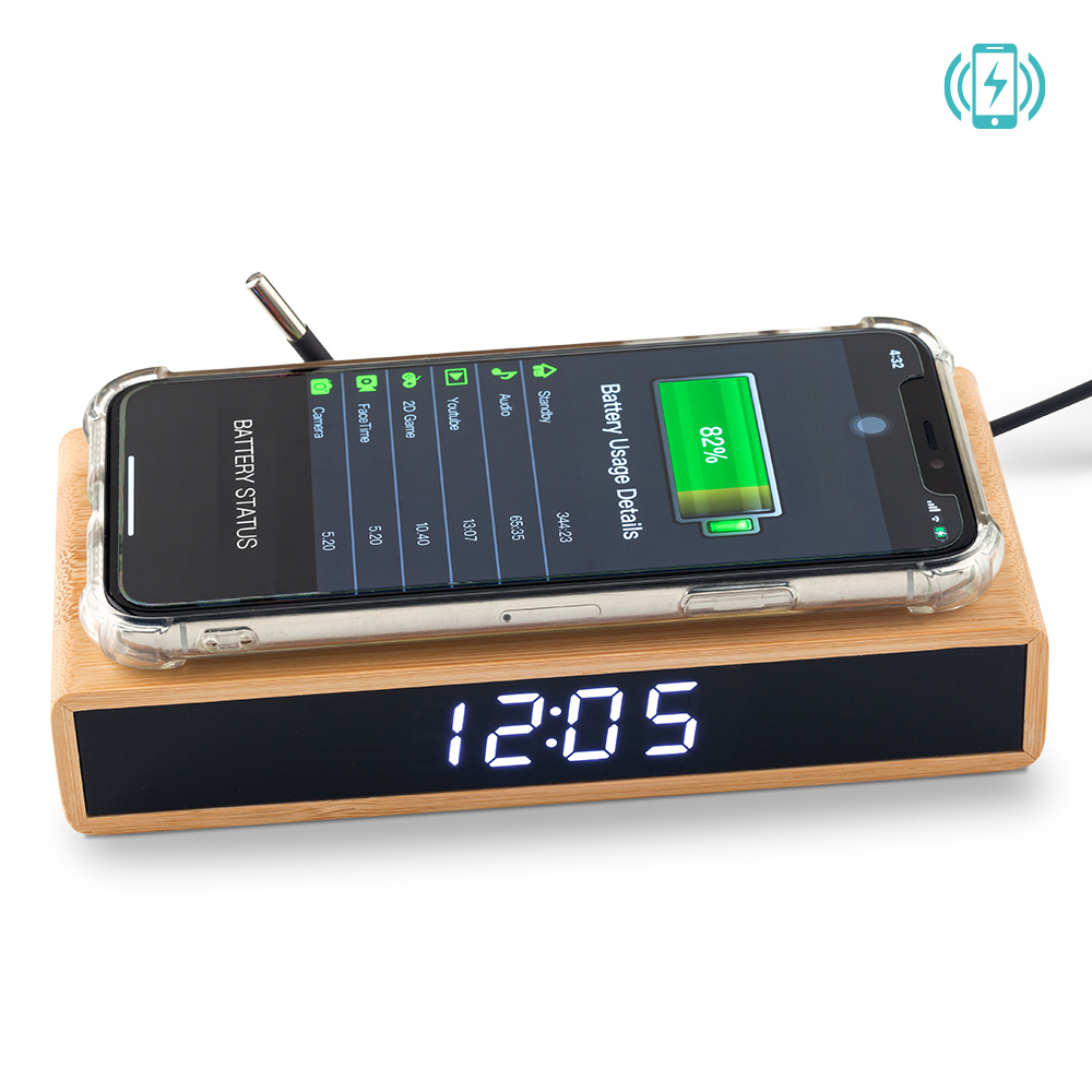 Cargador inalámbrico en bambú de 5W. Reloj digital con dos alarmas y temperatura. Input: DC 5V — 2A (Excluido) AC100-240V 50 60HZ. Empaque Caja Individual.