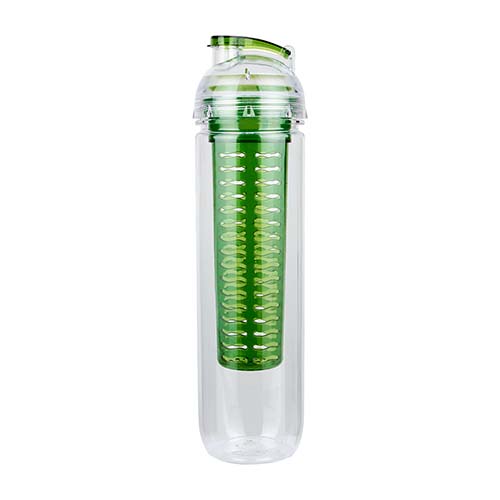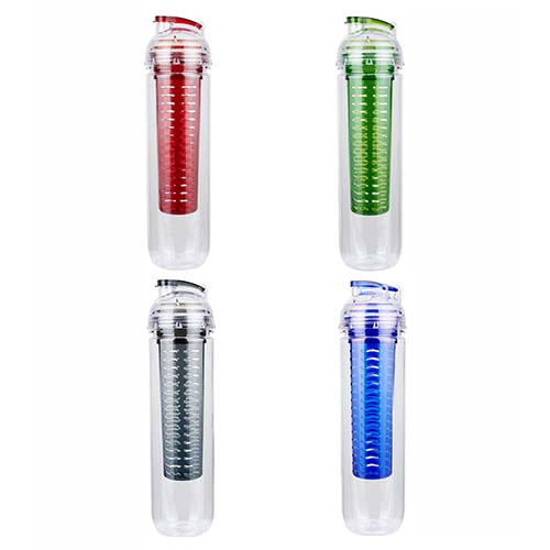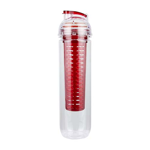 Cilindro con infusionador para frutas o bolsas de té. Tapa con sistema de rosca, boquilla y sobretapa que cierra a presión. Incluye caja individual.
