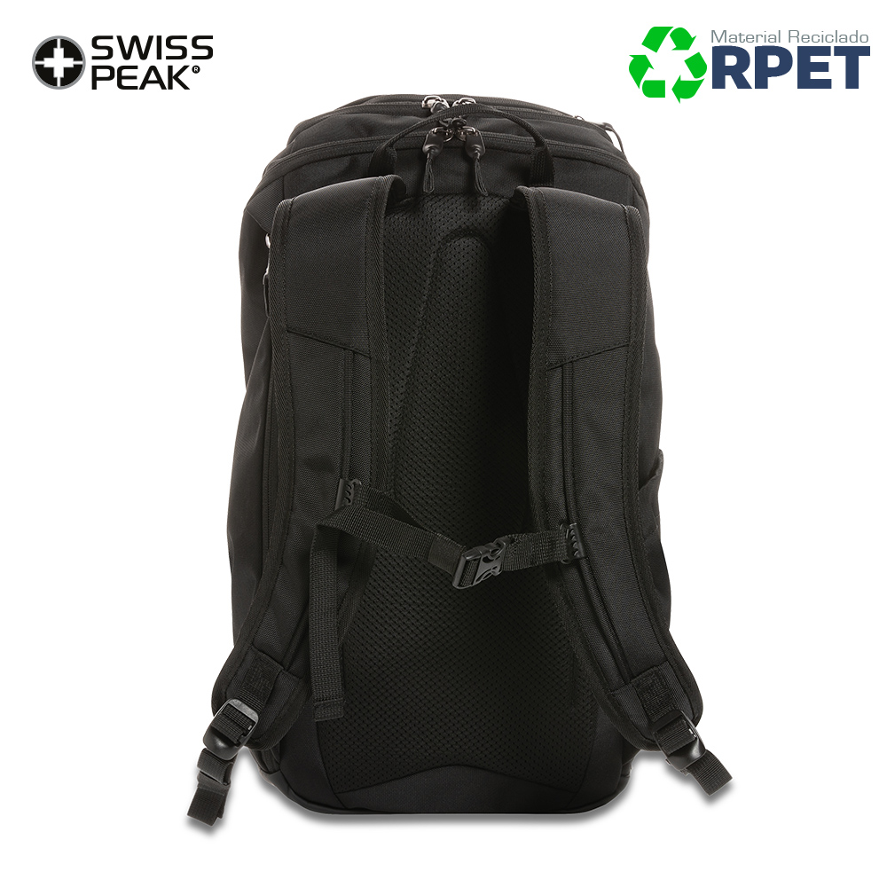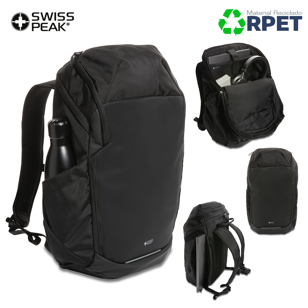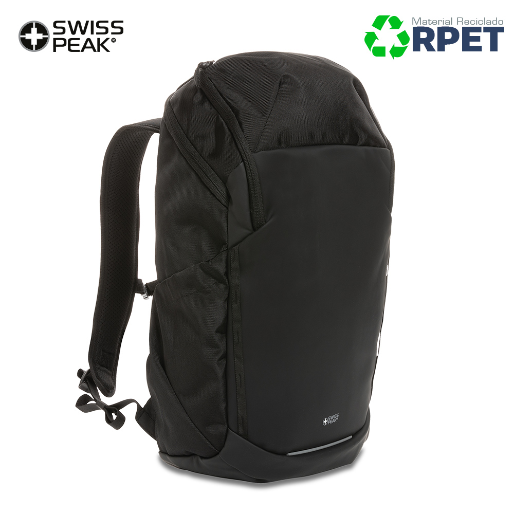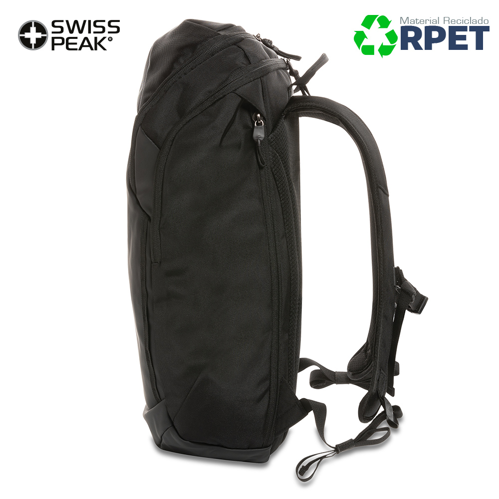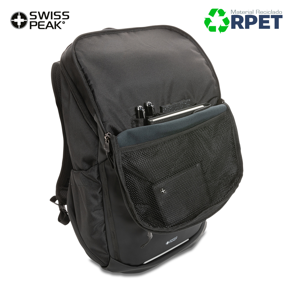 Morral Swiss Peak AWARE ™ elaborado en RPET de 15.6 pulgadas. Resistente a la intemperie, un compartimento principal y un acceso rápido al bolsillo del portátil a través de la cremallera lateral. Correas para los hombros transpirables. Espaldar acolchado y correas para el pecho ajustables. Bolsillos superiores con cremallera. Exterior fabricado con poliuretano y poliéster reciclado 1200D. El forro 150D confeccionado con poliéster reciclado 100%. Ahorro de 22,7 litros de agua, se ha reutilizado 38 botellas PET de 0.5 litros durante el proceso de producción.