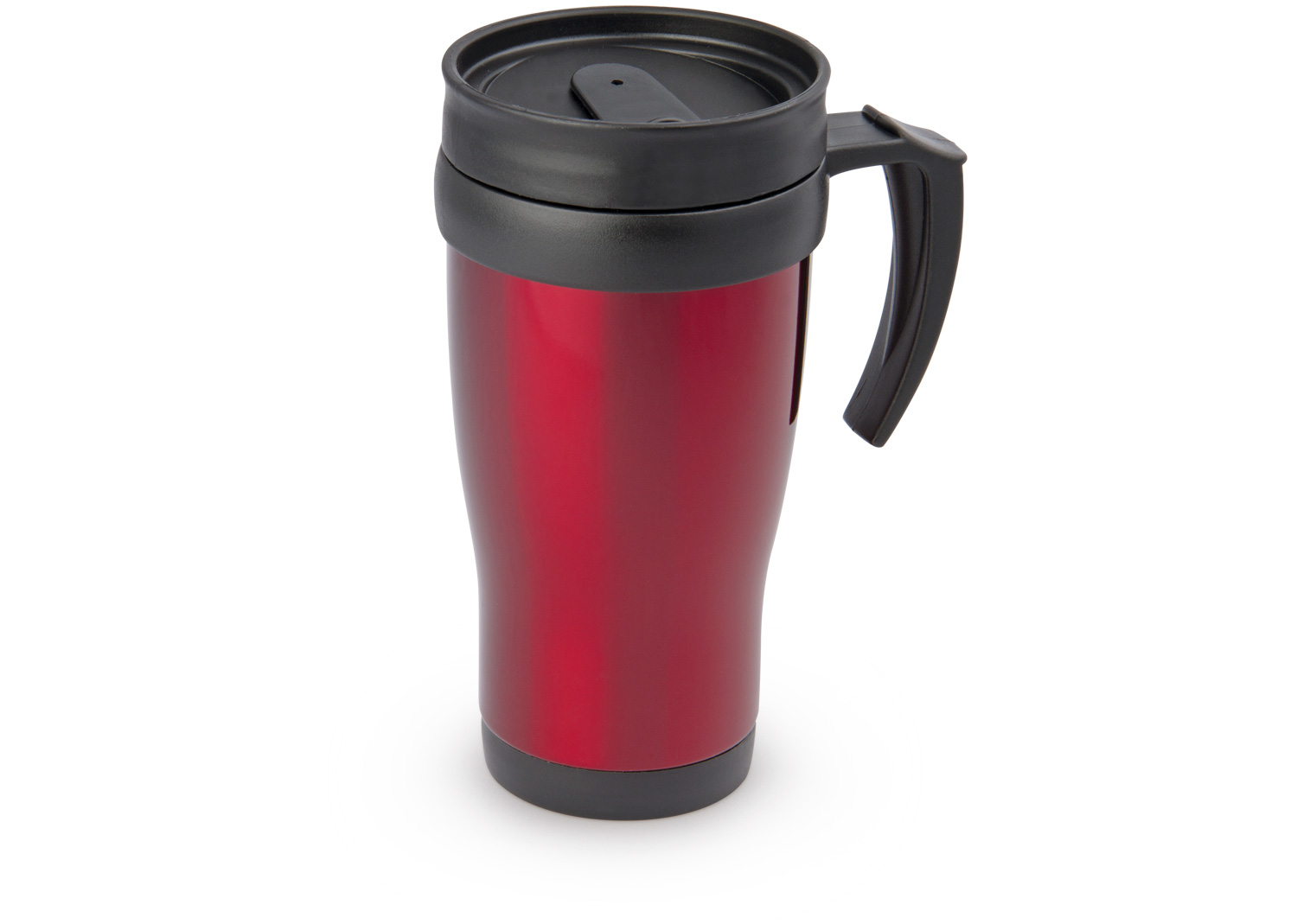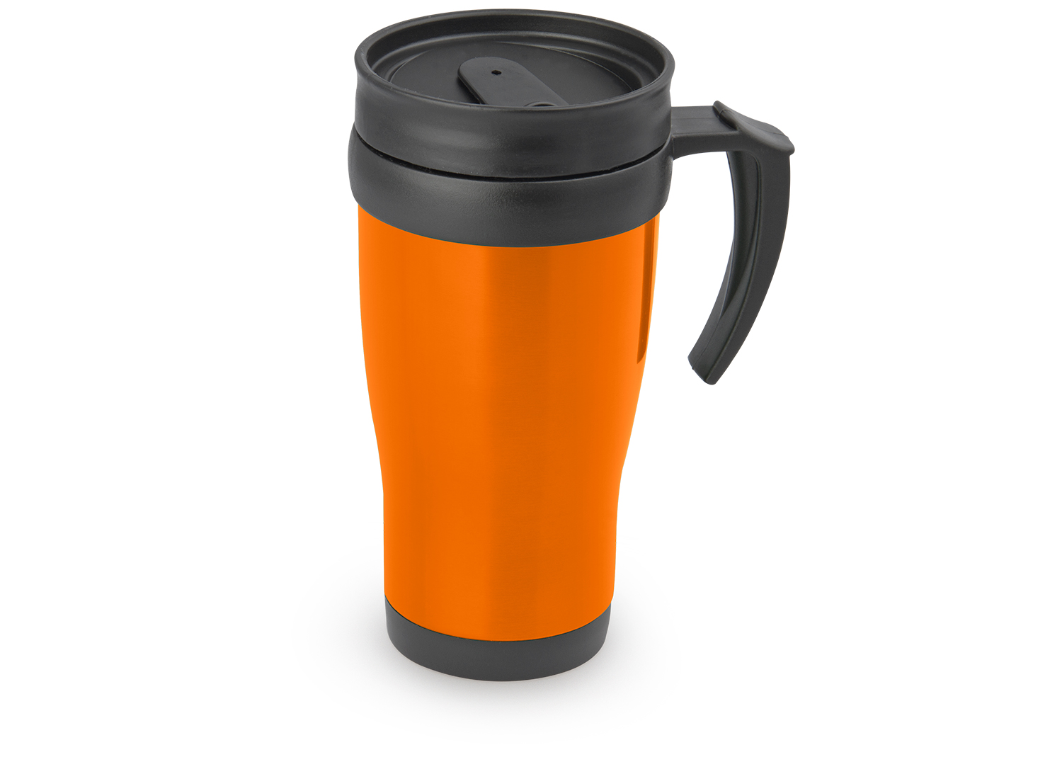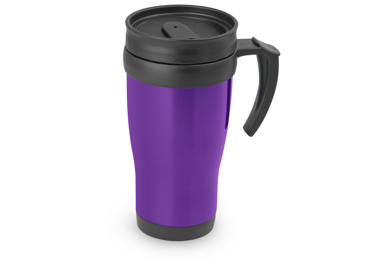 “Mug viajero doble pared con recubrimiento interior plástico, que permite la conservación de la temperatura de acuerdo al ambiente. Con agarradera y tapa corrediza para fácil transporte. Capacidad: 450 ml / 15 Oz.
