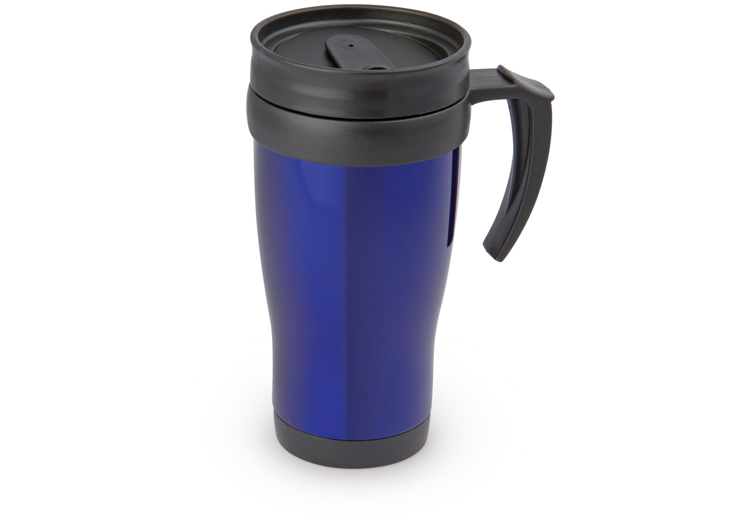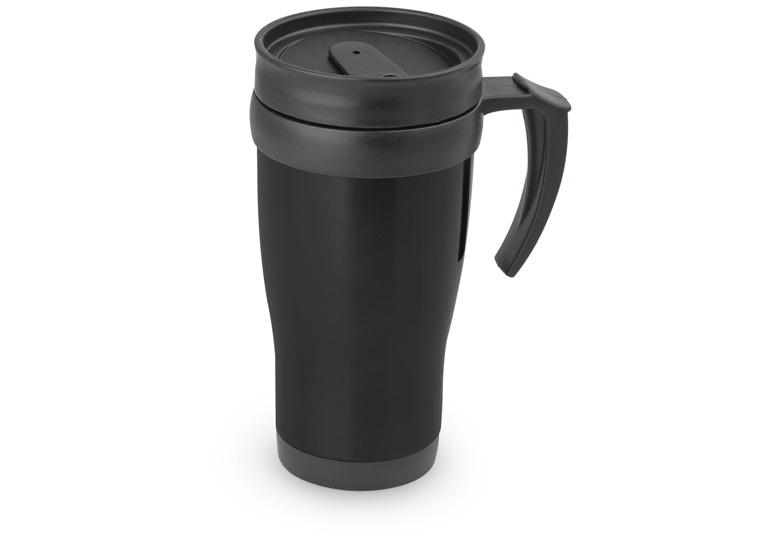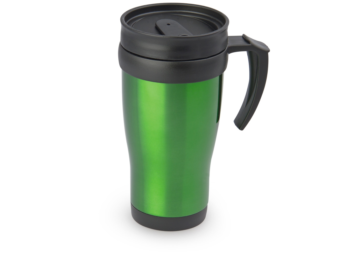 “Mug viajero doble pared con recubrimiento interior plástico, que permite la conservación de la temperatura de acuerdo al ambiente. Con agarradera y tapa corrediza para fácil transporte. Capacidad: 450 ml / 15 Oz.