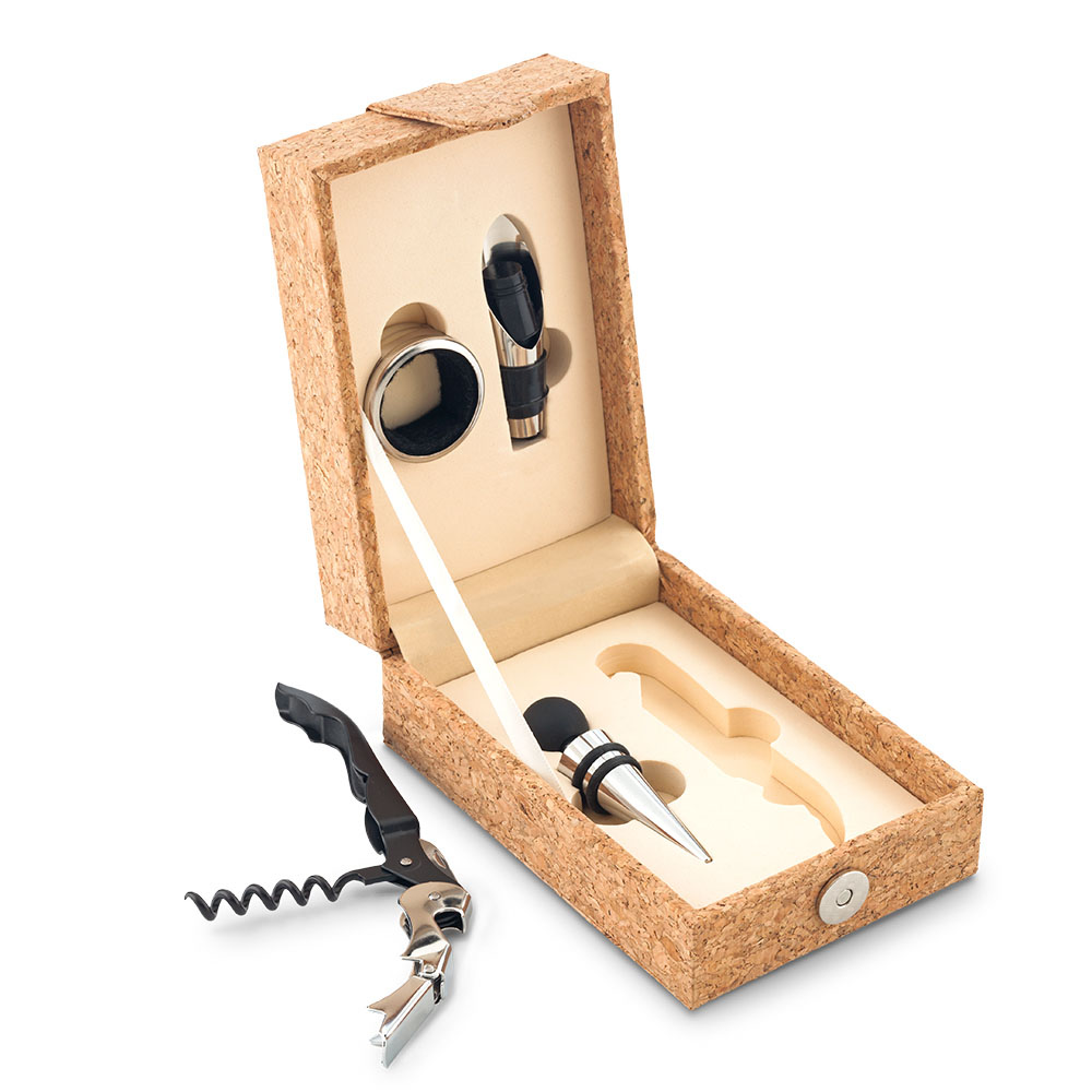 Set de vino en estuche de corcho, con dosificador, corcho descorchador y argolla antigoteo Empaque Caja Individual