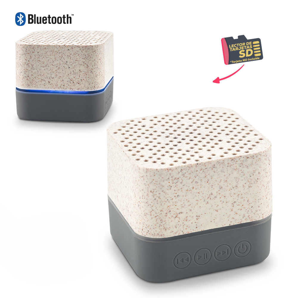 Speaker Bluetooth 5 0 plástico con material ecológico de fibra de trigo, 1x3W con luz multicolor, Tiempo de carga 2h aprox, Tiempo de reproducción 3h aprox, Batería 350mAh de capacidad. Lector de tarjeta SD (tarjeta no incluida). Empaque caja individual.